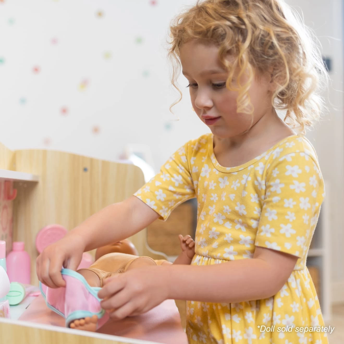 This multi-functional doll and stuffed animal wooden baby care activity center, combined with realistic play feeding, bathing, and changing accessories, has everything kids need to nurture and play with their special babies! The sturdy wooden center includes a kitchen with refrigerator, sink, and high chair. A changing and bathing area features a bathtub with spray nozzle and flip-down changing mat, a mirror, wipes dispenser, laundry chute, and washing machine with clicking dial. The nursery area has a rocking cradle, clothing storage, and shuttered window with a card that can be flipped to a daytime or nighttime scene. Stock the center with feeding accessories, including an easy-close, embroidered bib to keep baby clean, a divided dish, utensils, and baby food jars. “Disappearing” liquid bottles add to the fun! The Realistic bathing and diaper-changing accessories sized just right for dolls and stuffed animals include shampoo and bubble bath bottles, play soap, an owl-hooded towel, wipes, diapers, and more. There’s even a rubber ducky and bath book! Kids three and older will love having their very own space and supplies to nurture and care for their babies. Adult assembly required; detailed assembly instructions are included.