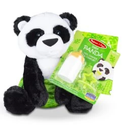 Snuggle up with the adorable Melissa & Doug Baby Panda plush stuffed animal! This little black and white panda cub with soft, silky polyester fur sits approximately 11 inches tall and comes everything to care for baby- a removable pacifier and baby bottle fit into the mouth, and theres a cozy cloth diaper to change! A reusable activity card has an adoption certificate to fill out, a care checklist, and fun facts about baby pandas in the wild! Kids two and older will love taking care of their very own baby animal.