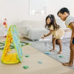 Help Camo Chameleon catch flies and bugs! The double-sided bean bag toss game for one or two players can sit horizontally or stand tall to provide several challenging ways to play. Eight numbered and color-coded bean bags featuring “delicious” insects for Camo to “eat” come with the colorful target to help kids four and older develop hand-eye coordination, number recognition and counting skills. Durably constructed for use either indoors or outside, the non-wobbling metal base is covered with strong polyester fabric. The whole things folds flat for easy storage.