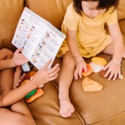 Satisfy hungry imaginations with this 17-piece set of durable realistic play food! Kids three and older will make memorable make-believe meals with the solid, realistically detailed food pieces, while also learning about nutrition and the importance of making and eating balanced meals. Combine & Dine includes proteins (BBQ ribs, a chicken drumstick, lamb chop, salmon filet), grains and starches (mac and cheese, mashed potatoes, spaghetti, rice pilaf), vegetables and beans (cauliflower, green beans, baked beans, and sliced carrots), and desserts (cupcake, orange segment, brownie, apple pie), as well as a four-sided menu and information card. This playful food set lets young foodies create countless combinations to serve well-balanced fun!