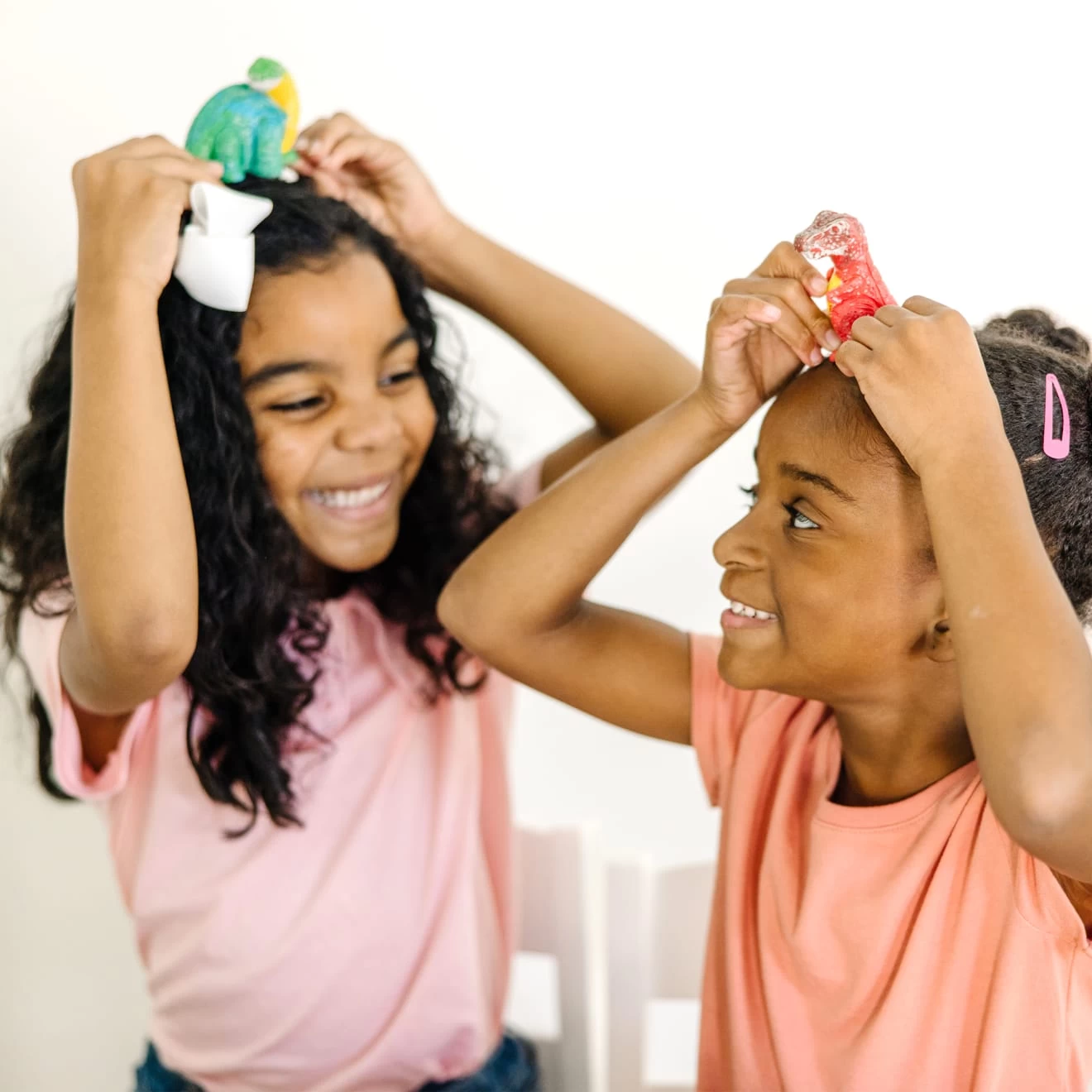 These two ready-to-decorate, solid-resin dinosaur figurines are waiting to be painted by a dino lover! 6 pots of colorful, non-toxic paint and an easy-clean paintbrush are all included. Figures measure approximately 2″ and 4″ inches high.