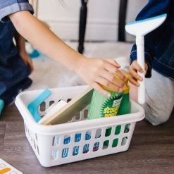 Have loads of laundry and cleaning fun keeping everything spotless and sparkling! Housekeeping is never a chore with these realistic kid-sized cleaning and laundry accessories! Sweep, dust, and mop with a solid wood-handled mop, broom, duster, and brush that hang to store, along with a dustpan, on a sturdy stand. Keep play clothes clean with laundry essentials like a basket, detergent bottle, dryer sheets, wooden ironing board, and iron. And scrub and wash with a scrub brush, scouring powder can, sponge, spray bottle, squeegee, and more! Built to last and sized just for kids, the play set helps kids develop fine motor skills, encourages them to get up and moving, and helps foster creativity and imagination. Mimicking everyday chores helps teach responsibility and boosts self-esteem.