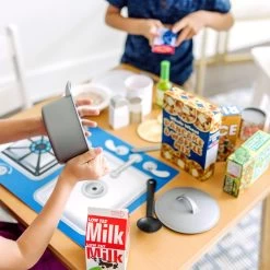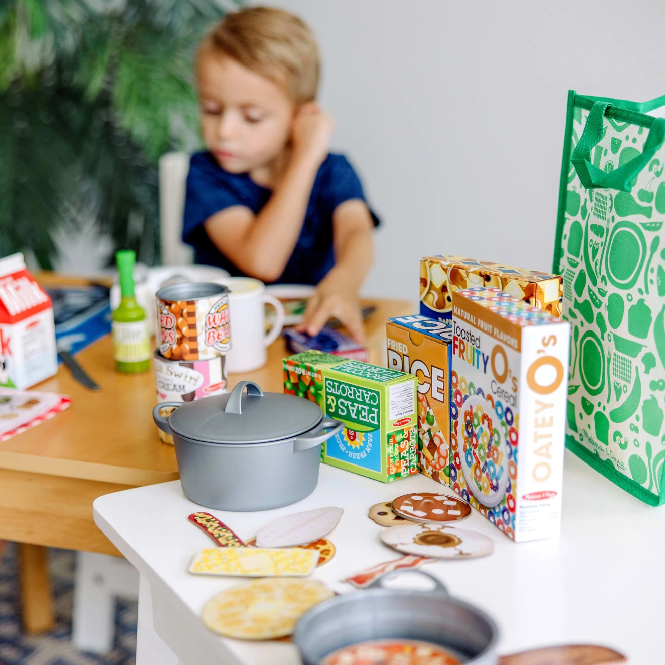 Satisfy the hungry imaginations of kids three and older with this all-inclusive collection of durable pretend play serving utensils, dishes, and cookware, double-sided play food pieces, and realistic grocery boxes and cans! Dozens of double-sided play food pieces and drink inserts show either cooked and uncooked or different food options to combine to make countless make-believe meals! Stock play kitchens, restaurants, and grocery stores with pretend play food boxes and cans. “Cook” with durable pot, skillet, colander, and serving utensils on the stovetop and sink play mat, then serve using the included durable place setting. Round out the play experience with a sturdy grocery tote and reusable activity cards!