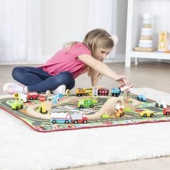 Create a world of endless adventures with the Deluxe Multi-Vehicle Activity Rug! Use the four train cars, 13 on-road road vehicles, helicopter, and boat to visit the train station, firehouse, school, market, hospital, recycling center, lake, and more on the illustrated play rug. Arrange and rearrange 12 included wooden traffic signs. The set includes an oval, wooden train track with a three-piece train bridge/tunnel and working railroad crossing gates! The helicopter blades turn, the cement mixer and dump truck spin and tilt, and the wheeled trains attach with magnetic couplers. The over-sized (39.5″ x 36.5″) durable rug is stain resistant and machine washable with skid-proof backing and a reinforced border binding for years of imaginative, hands-on play!