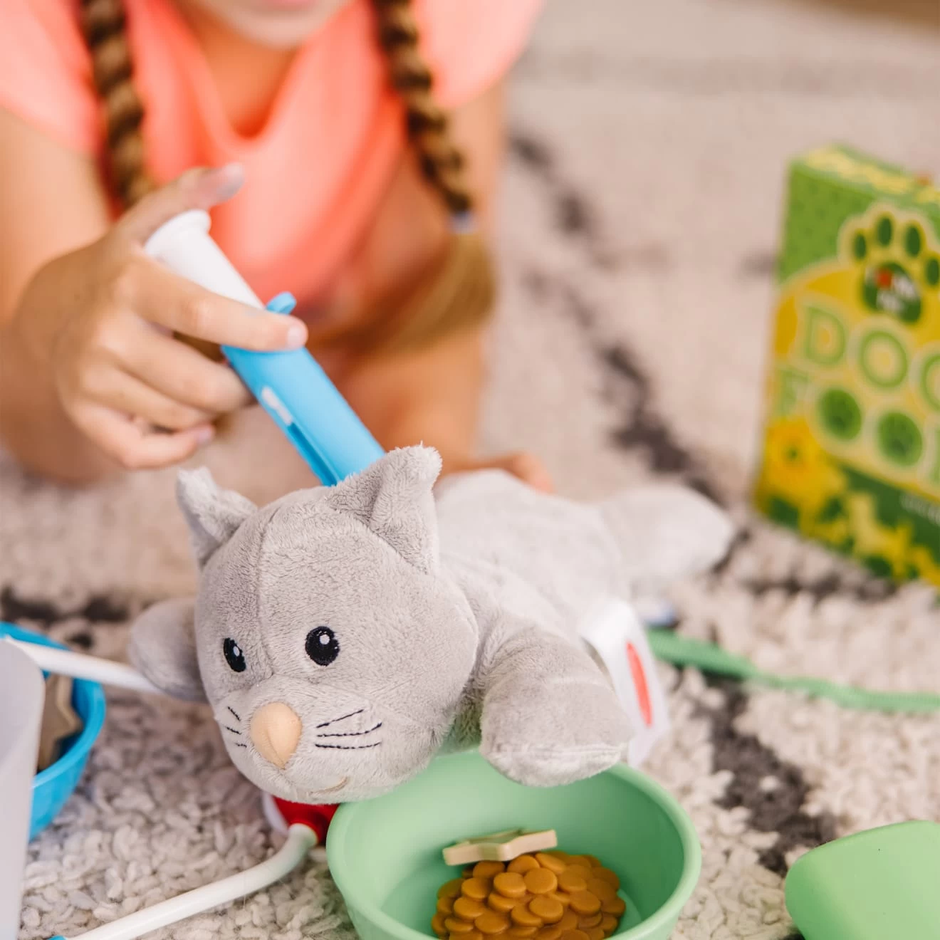 Give young animal lovers everything they need to examine, treat, feed, and pamper pretend plush pets! The 32-piece collection for aspiring veterinarians and groomers three and older comes with two adorable plush pets (a dog and a cat), and accessories galore, including vet supplies like a stethoscope, thermometer, syringe, bandages, a cast for boo-boos, and even a neck cone! Grooming supplies include vibrating trimming shears, pretend shampoo, and brush. Reward plush pets with treats, play food, and more. Keep track of appointments on the reusable activity card and personalize collars and tags with stickers. All the supplies store in a handy tote bag for speedy cleanup and to take fun on the go!