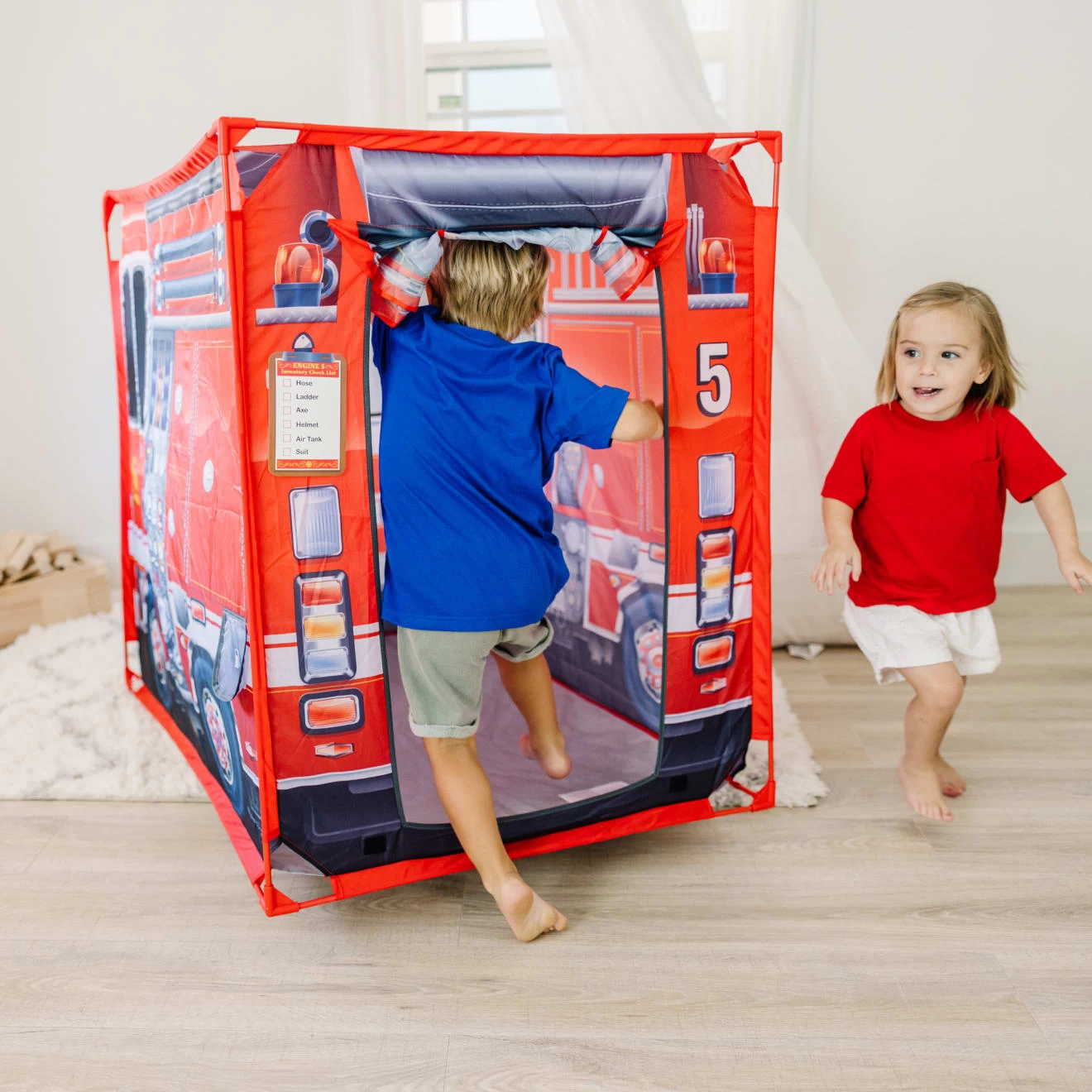 Theres plenty of room to get playtime adventures rolling and let imaginations race to the rescue in this roomy and exciting fire truck play tent! The large, sturdy fabric playhouse for kids three and older stands nearly four feet long and more than three feet tall, giving plenty of space for multiple kids to play. The fire truck exterior is covered with vibrant, full-color artwork showing hoses, dials, lights, and firefighting equipment. This unique play space is packed with playful details, such as a back door flap that rolls up, a roof flap that opens, gas cap that flips up, mesh fabric in the windows, and durable floor material. A reusable checklist attaches to the outside of the fire truck! The play tent is easy to assemble and easy to pack away in the handy take-along storage tote.