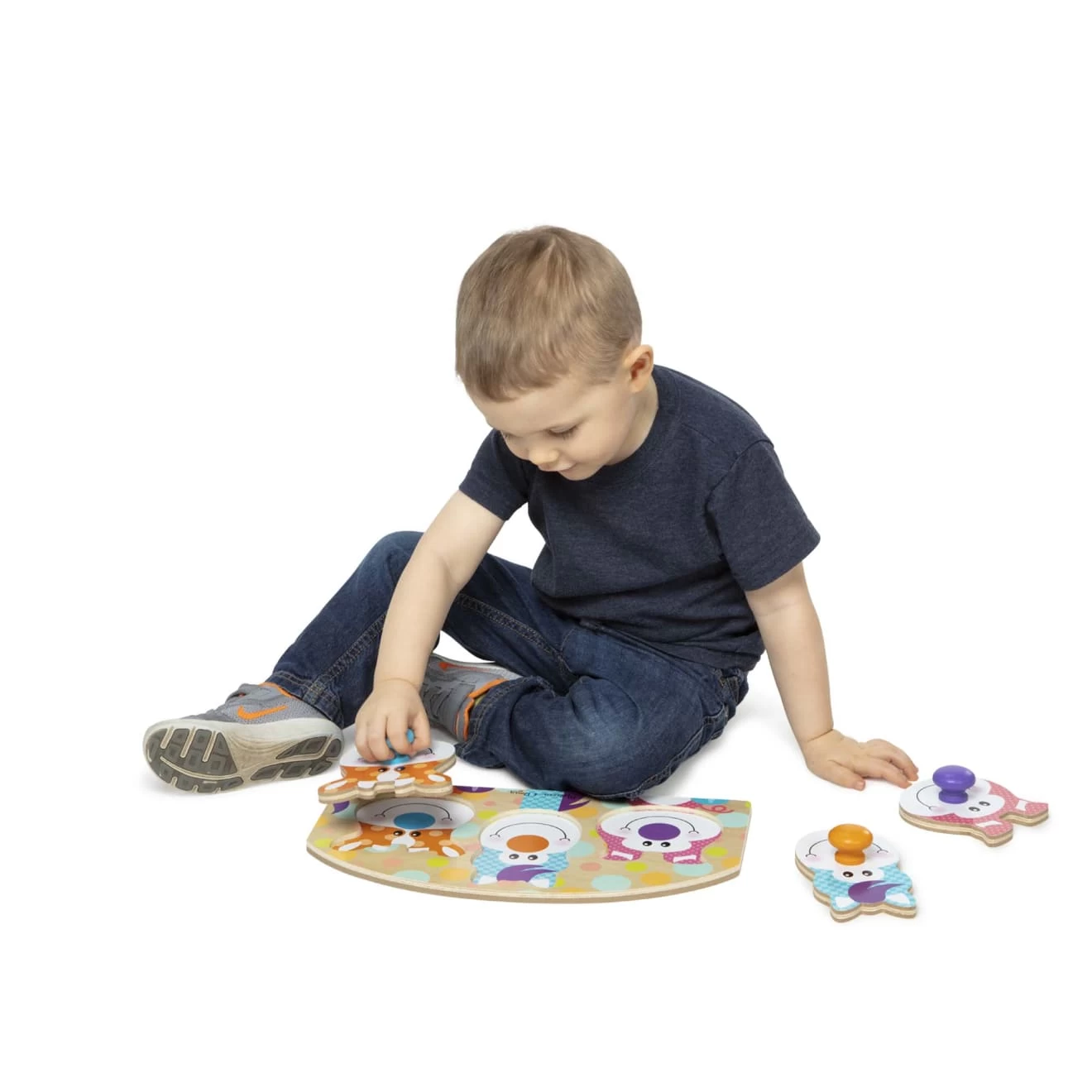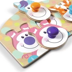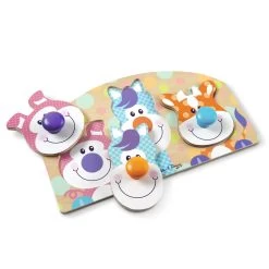Little hands and big imaginations will love these friendly wooden farm animals with oversized noses! The smiling pig, horse, and cow have wooden knobs for noses that are easy to grasp. Babies and toddlers will delight in matching pieces to pictures on the sturdy wooden 14-inch by eight-inch puzzle board, discovering colors and patterns, and developing fine motor skills. First Play puzzles and toys feature bright colors, bold patterns, and whimsical designs that boost skills while sparking imagination and wonder – right from the start!