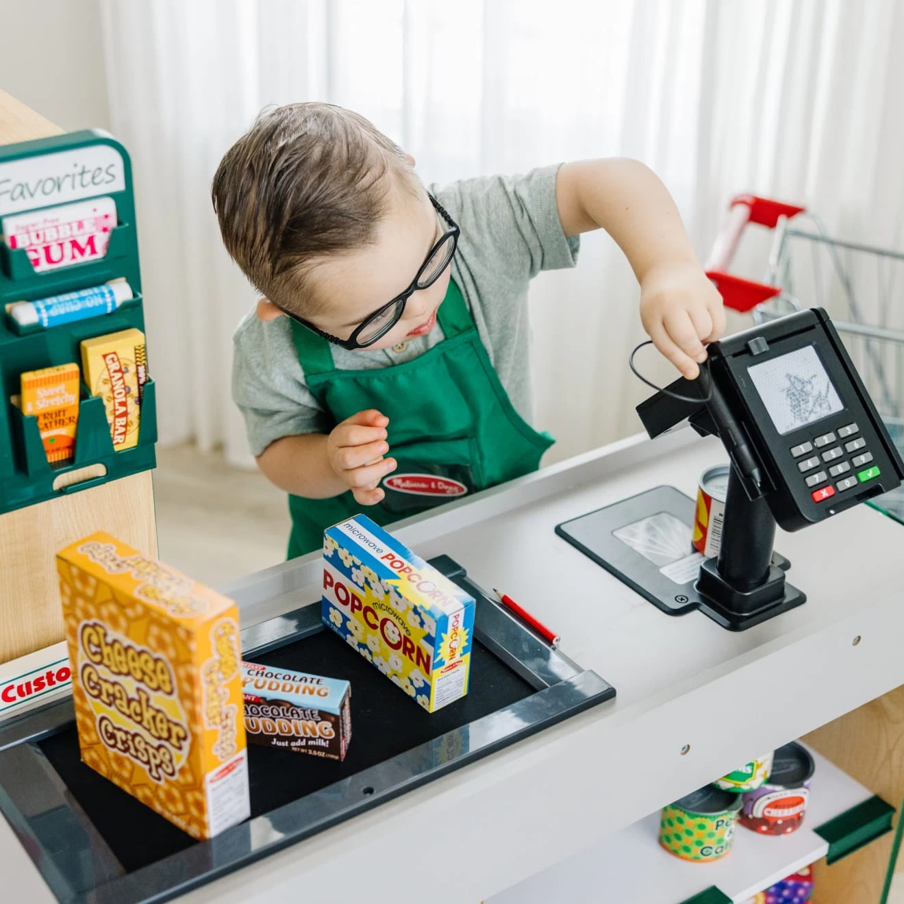 This companion set to the Fresh Mart Grocery Store has everything kids three and older need to stock shelves and get shopping! There are 70 pieces to play with, including grocer and shopper role-play items like an apron, conveyor belt divider bar, and a cloth shopping bag, a fully stocked grab-and-go rack designed to hang on the grocery store shelf (holds gum, granola bar, a magazine, and more!), play money, cards, and coupons, and grocery boxes and cans! This set plays perfectly with the Melissa & Doug Fresh Mart Grocery Store!
