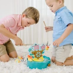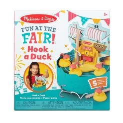 Step right up and turn any day into Fair Day! Melissa & Doug Fun at the Fair!â„¢ Hook a Duck lets kids three and older experience the excitement of the classic fairground fishing game at home! Start playing by inserting the secret-reveal player card ticket in the base to reveal a secret picture. Wind the pirate ship wheel to make the base spin (no batteries required!) and set the rubber ducks in motion. Use the wooden fishing rods to try your luck hooking a duck! Numbers and shapes on the bottom of the ducks allow for lots of matching, counting, or point-earning games. Fun for independent play, cooperative play, or challenge a friend. Designed to amuse, surprise, and challenge kids three and older to keep them laughing and learning through play, Hook a Duck is an engaging, hands-on way to encourage counting, matching, and fine motor skills. From games of skill and chance to innovative carnival-inspired play sets, the Melissa & Doug Fun at the Fair!â„¢ collection brings home all the fun of a day at the fair!