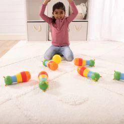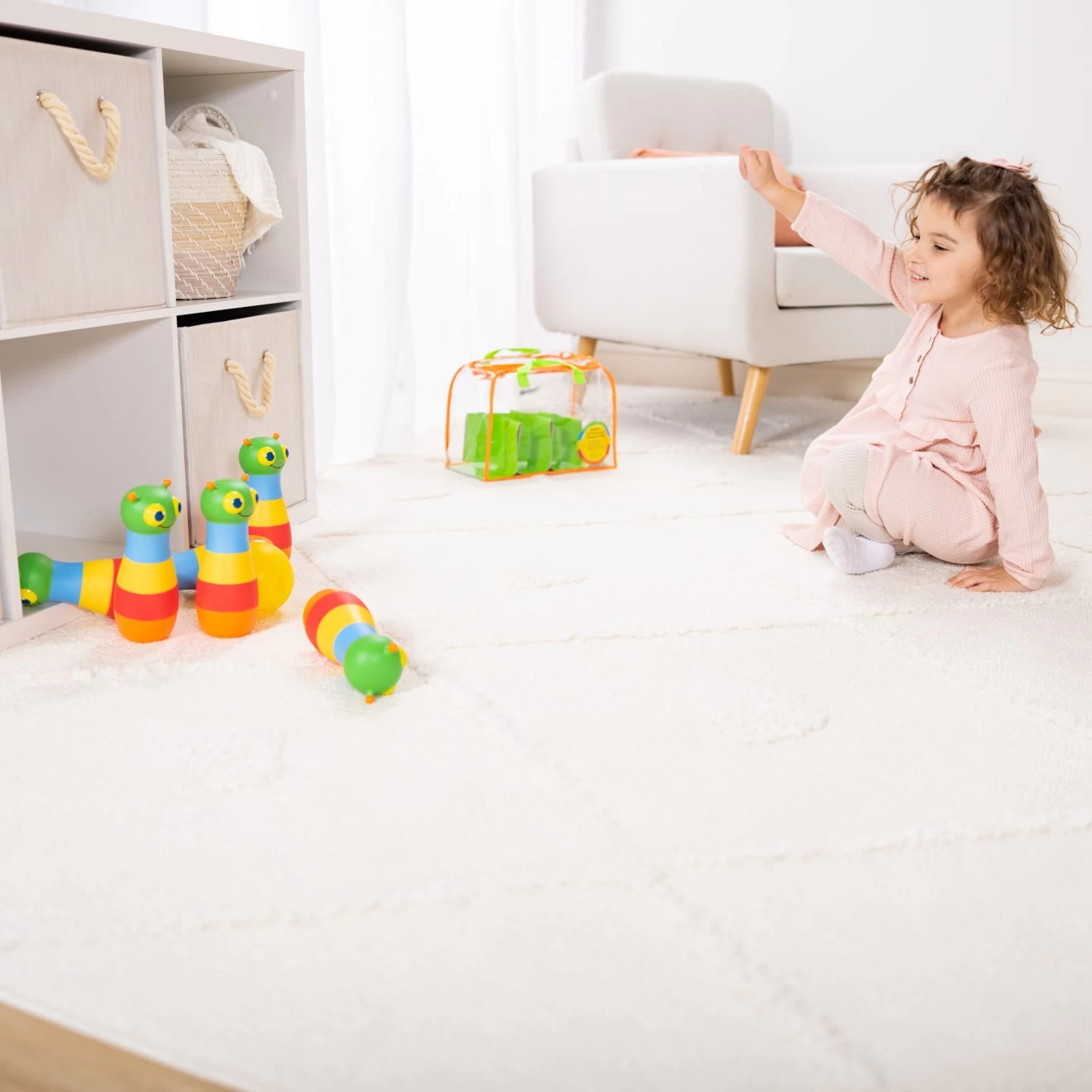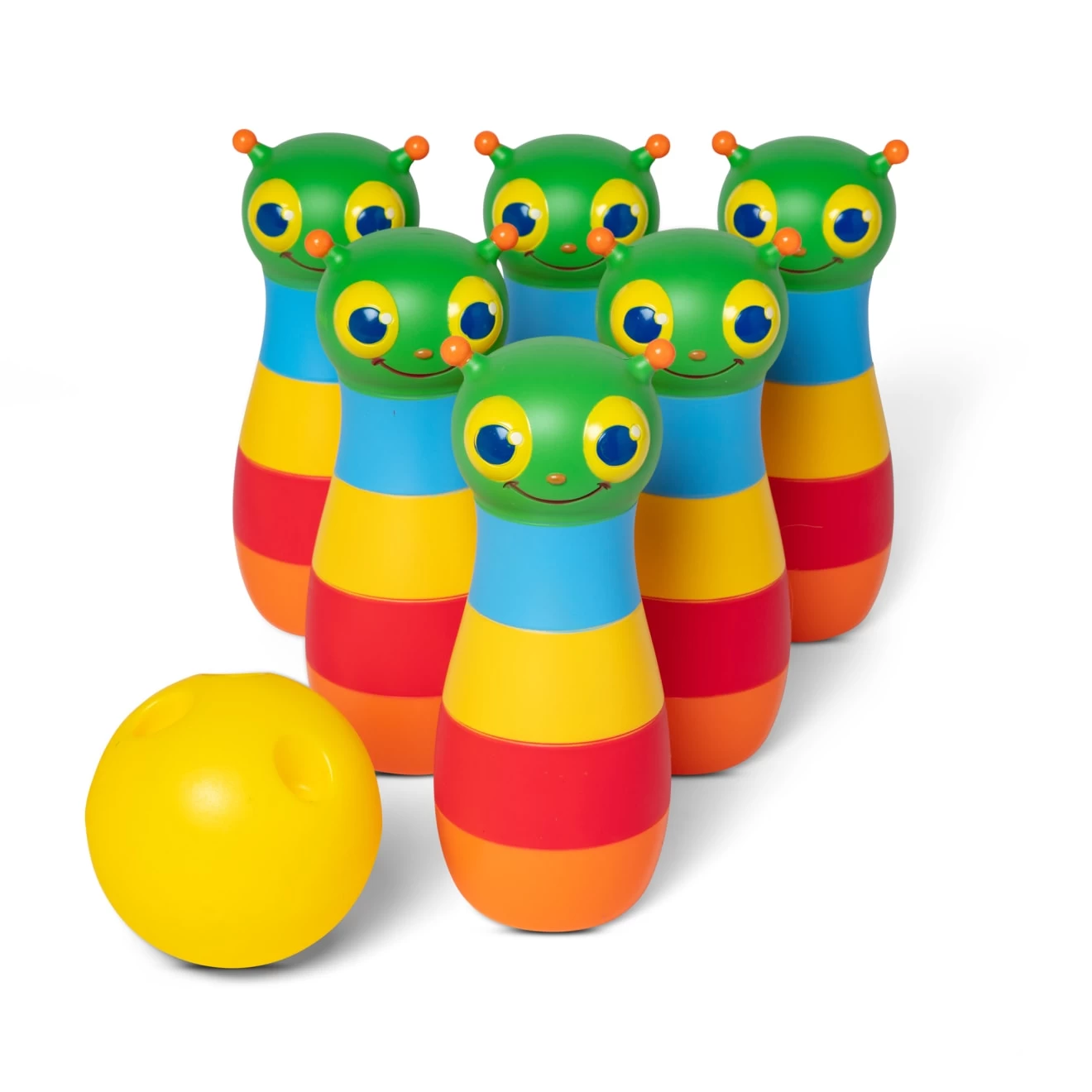 You’ll have fun to “spare” playing with this brightly colored plastic bowling set! Six bowling pins and a mini bowling ball fit into a handy bowling bag with durable fabric handles. Set the Happy Giddy pins in formation and you’re ready for a perfect game.