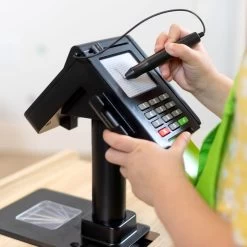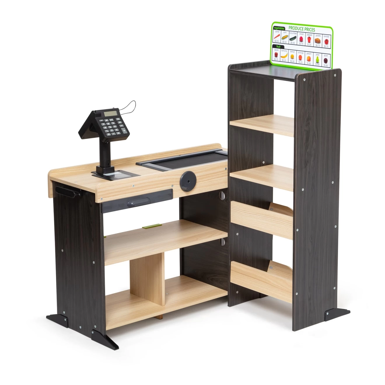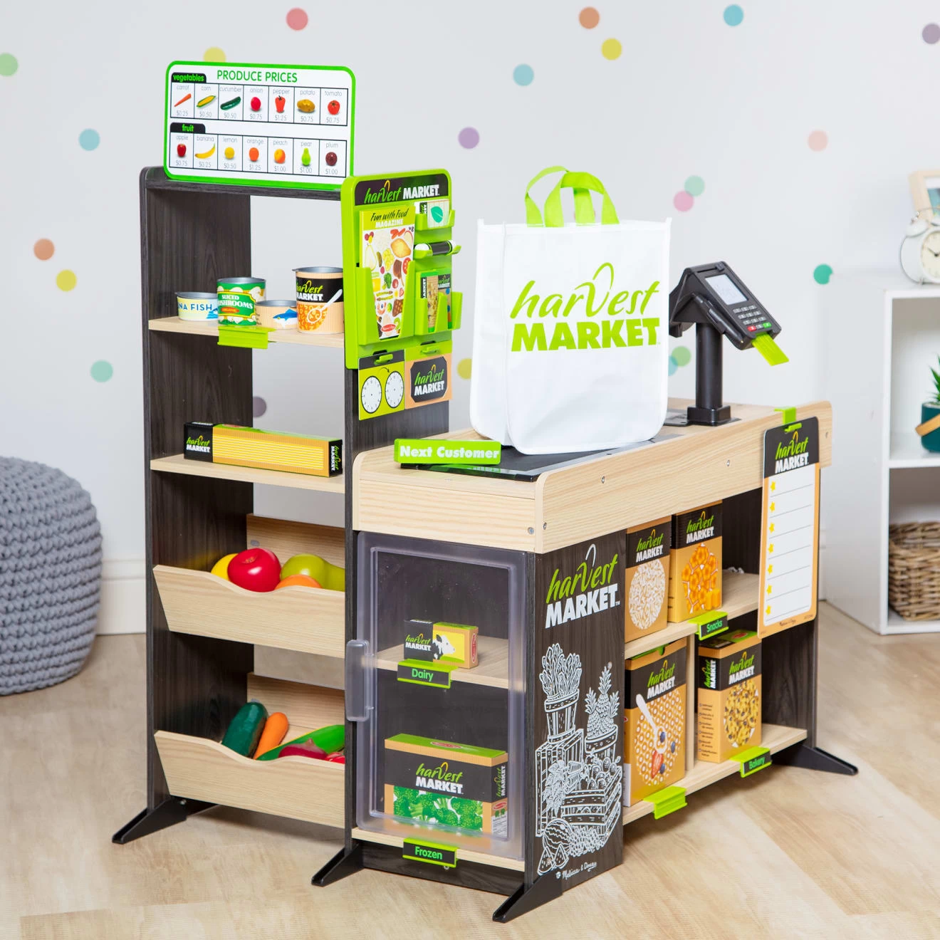 The Melissa & Doug Harvest Market Grocery Store and Accessory Set has everything kids need to open their own play grocery store and get shopping! The sturdy wooden free-standing play space (27.5” x 35” x 35.7” assembled) with smooth, curved corners and edges and a sleek, upscale look, lets customers three and older browse the shelves and pay for purchases on one side, and allows the clerk to ring up items on the other. Realistic features include beeping “scanner,” (two AA batteries required, not included) a hand-crank conveyor belt, a card-swiping machine, a keypad/calculator, and cash drawer. Coordinating accessories include grocer and shopper role-play items like an apron, conveyor belt divider bar, and a cloth shopping bag; play money, play grocery boxes and cans (some components English only); a fully stocked grab-and-go rack (gum, granola bar, a magazine, and more!); write-on signs, cards, and coupons! Some components English only. Step-by-step illustrated instructions included (adult assembly required).