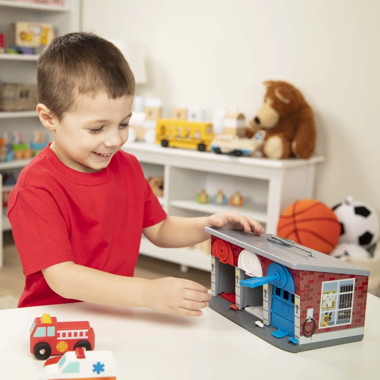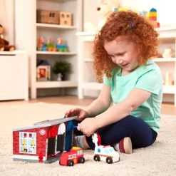 Behind the three doors of this take-along garage are three rescue vehicles ready to roll into action! Match the colored keys to unlock the doors, slide the door to open the garage, press the buttons to release the ramp and send the vehicles racing to the rescue. Store the pieces away and carry off the whole set by its sturdy handle. The real heroes of this story? The dynamic duo of motor-skills practice and imaginative play!
