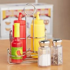 A must-have for the well-appointed play kitchen, these condiments sound and look like the real thing! Packaged in a handy metal caddy to keep everything organized, the six-piece set includes ketchup, mustard, salt, pepper, and hot sauce. Best of all: The salt and pepper really “shake,” the hot sauce really “pours,” and the ketchup and mustard “squirt” string! These wonderfully durable play pieces are built to last through countless culinary adventures.