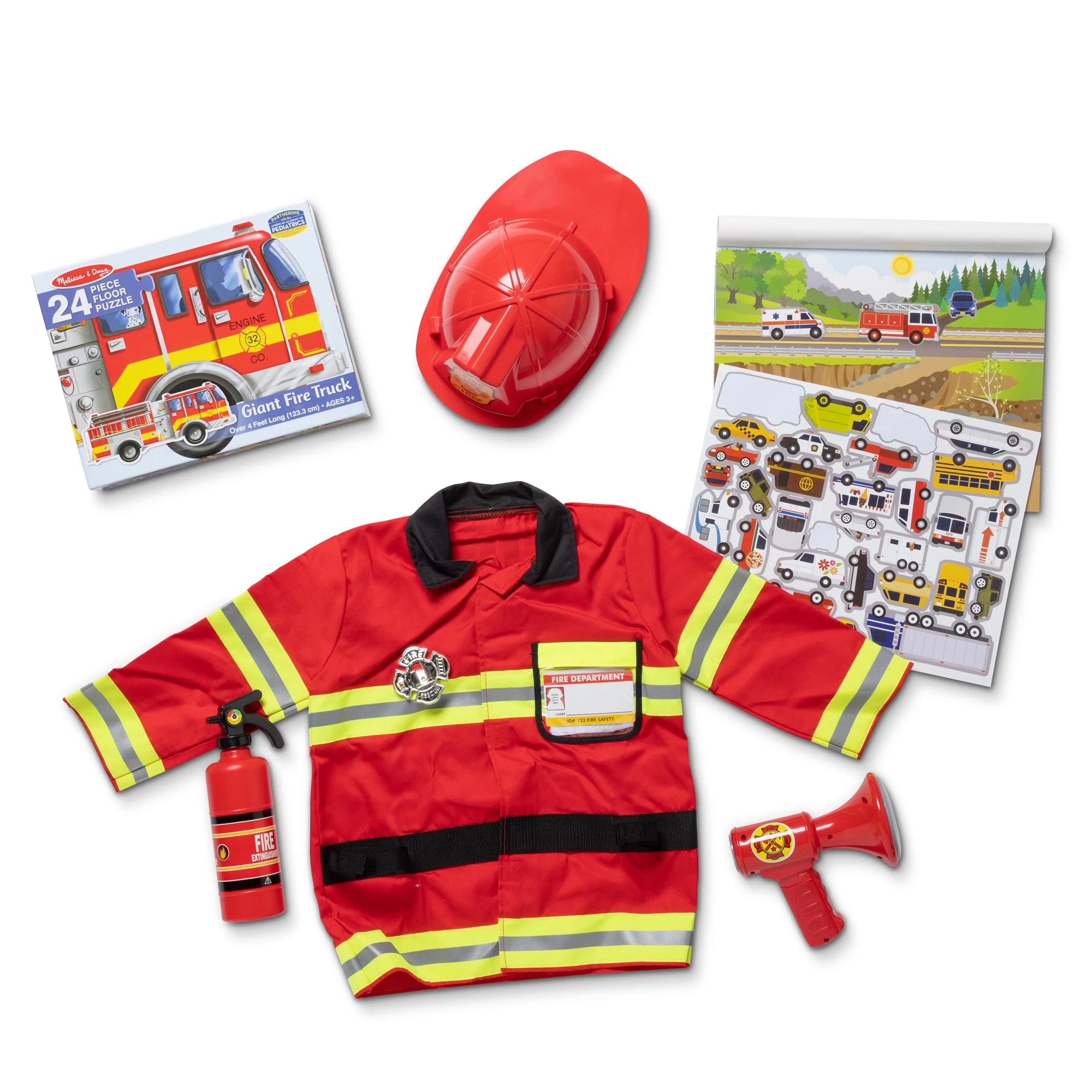 This three-piece gift set is perfect for exciting pretend play! Little heroes can dress the part with a realistic Fire Chief Role Play Costume Set with bullhorn. The Giant Fire Truck Floor Puzzle has 24 pieces and is shaped like a fire engine. An extra-large vehicle-themed Reusable Sticker Pad has more than 165 cling-style stickers to tell stories on five glossy color backgrounds. Melissa & Doug timeless toys inspire creative thinking through screen-free, open-ended play! Please note, items may ship separately.