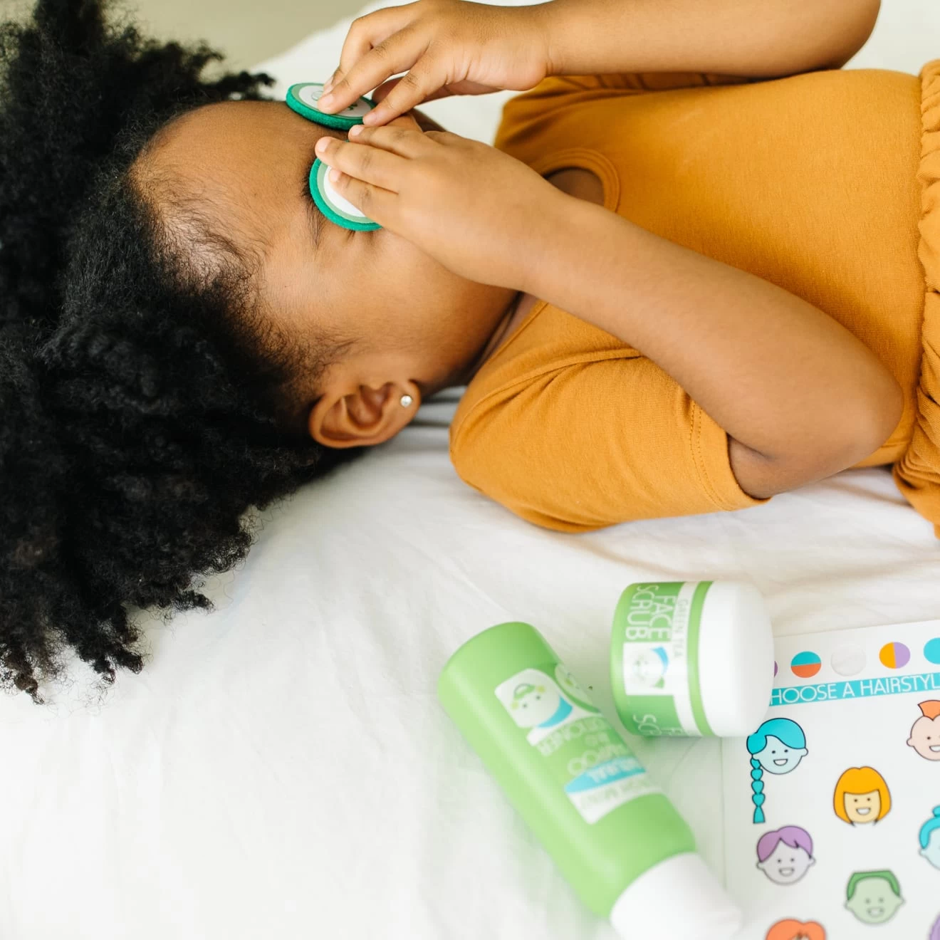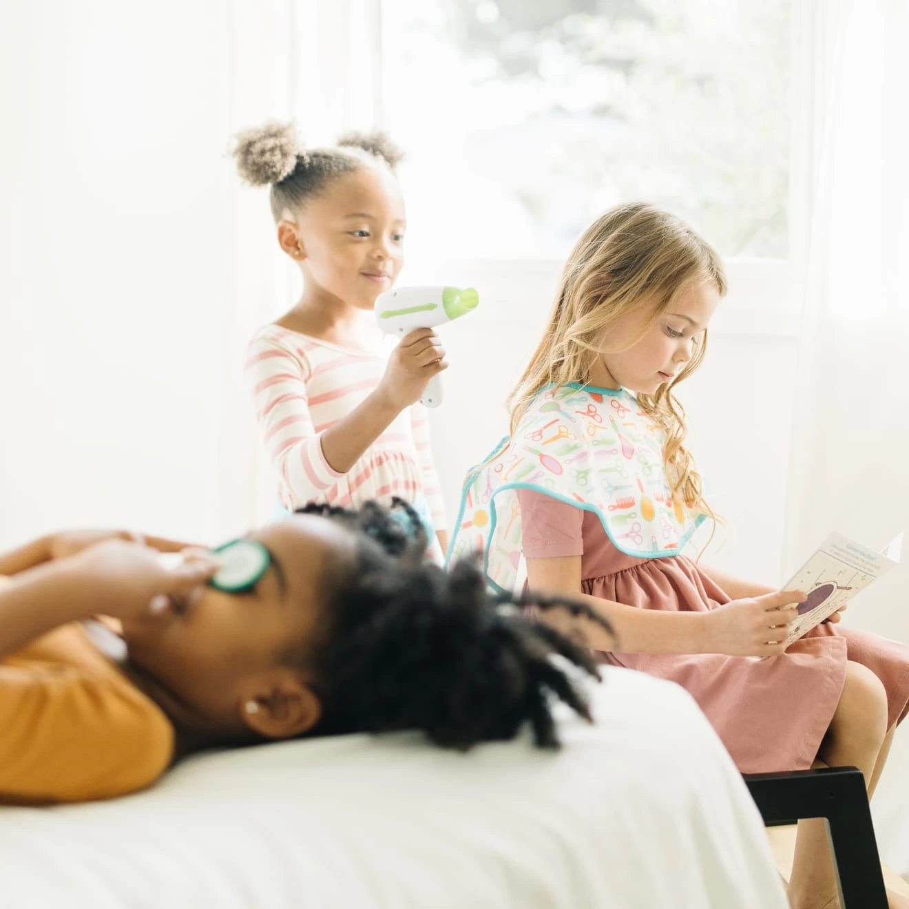 This 16-piece set gives kids everything they need to play spa and salon! Little stylists can wear an apron and pop the protective cape on a customer, then pretend to wash, cut, and style hair with a shampoo bottle (does not contain shampoo), play scissors, brush, comb, and a hairdryer that really blows air! Pamper customers with salon essentials like pretend facial scrub (squishy insert feels real but does not contain actual product) and fun felt cucumber eye pads. Dont forget to clean up between customers with the dustpan and dust brush! Enhance imaginative play with a waiting room magazine and activity cards to choose services and hairstyles. Role playing real-life experiences with Love Your Look play sets is a great way for kids three and older to build confidence, empathy, and self-esteem.