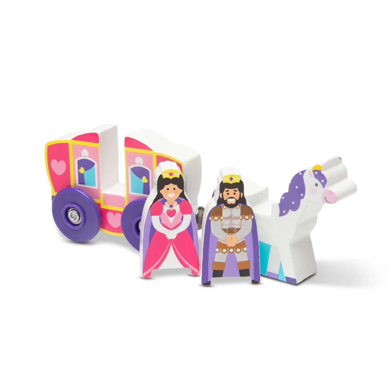 Have enchanted adventures on this charming and colorful sturdy play rug. Durably made to look great for countless playtimes to come, the woven rug (approximately 39 inches by 36 inches) with a skid-proof backing comes with four wooden play pieces (prince, princess, wheeled carriage, unicorn). The rug features details like a castle, river, roads, flower gardens, bridges, and more to give many options for creative play. This adorable activity rug, a perfect gift for kids three and older, promotes fine motor skills, creative play, and a kingdoms worth of imagination!