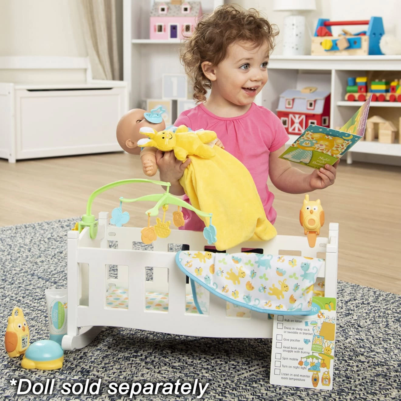 This 11-piece play set gives kids everything they need to soothe, snuggle, and tuck in favorite baby dolls and stuffed animals. After soothing with pretend lotion and a pacifier, baby is sure to have sweet dreams snuggled into the sleep sack or wrapped in the cozy blanket, both decorated with adorable animal characters. There’s a working night-light (Two AA batteries required, not included), a spinning mobile, a bedtime book, stuffed bunny rabbit for cuddling, and a double-sided reusable activity card. Kids can even keep an eye on their sleeping sweeties with the two owl-shaped play baby monitors! With Mine to Love toys, kids three and older can explore grown-up roles and responsibilities while having endless fun caring for their babies. (Dolls/stuffed animals not included with this set.)
