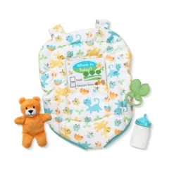 When little caregivers need to be hands-free, there’s nothing better than this realistic baby carrier for kids’ favorite dolls and stuffed animals! The adjustable carrier holds dolls up to 18 inches and can be worn in the front or back, with “baby” facing forward or backward. The play set includes a toy stuffed bear, baby bottle, butterfly rattle, and a reusable double-sided activity card, all of which tuck conveniently into two pockets in the carrier. Sturdy construction and machine washable. With Mine to Love toys, kids three and older can explore grown-up roles and responsibilities while having endless fun caring for their babies. (Dolls/stuffed animals–other than the small toy bear–not included with this set.)