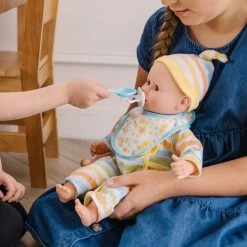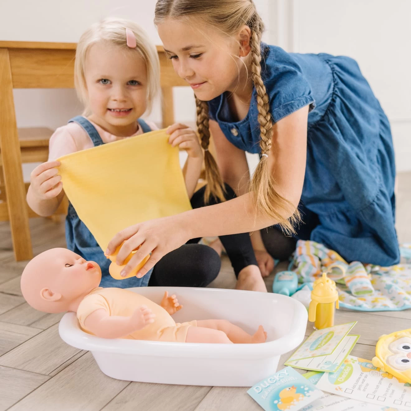 Give kids everything they need to take care of a sweet 15-inch baby doll! This all-inclusive 48-piece deluxe set includes accessories to feed, bathe, change, and cuddle the soft-bodied doll with wipe-clean head and limbs, eyes that open and close, and that sucks its thumb or pacifier. Pretend to bathe baby in the bathtub with bubble bath bottle, pretend soap, and dry off with the adorable hooded towel. Changing accessories include diaper, lotion pump bottle, and ointment tube. At mealtime, theres a bottle, rice cereal, baby food jars, sippy cup, squeeze pouch, teething biscuits, and more. Extras include activity cards, blanket, a birth certificate, and a bedtime book. Mine to Love dolls and accessories encourage empathy and help kids three and older express themselves as they explore grown-up roles and responsibilities. A childs confidence and self-esteem blossom and grow with each nurturing moment of imaginative play!