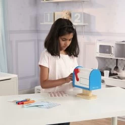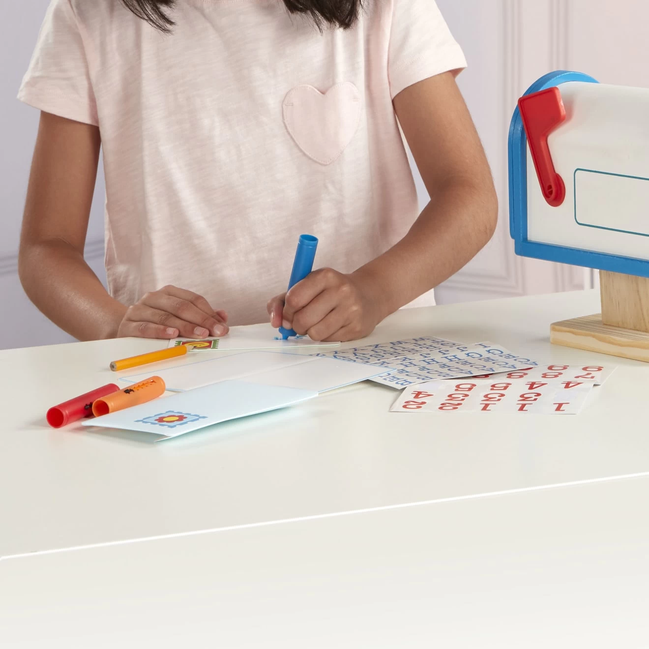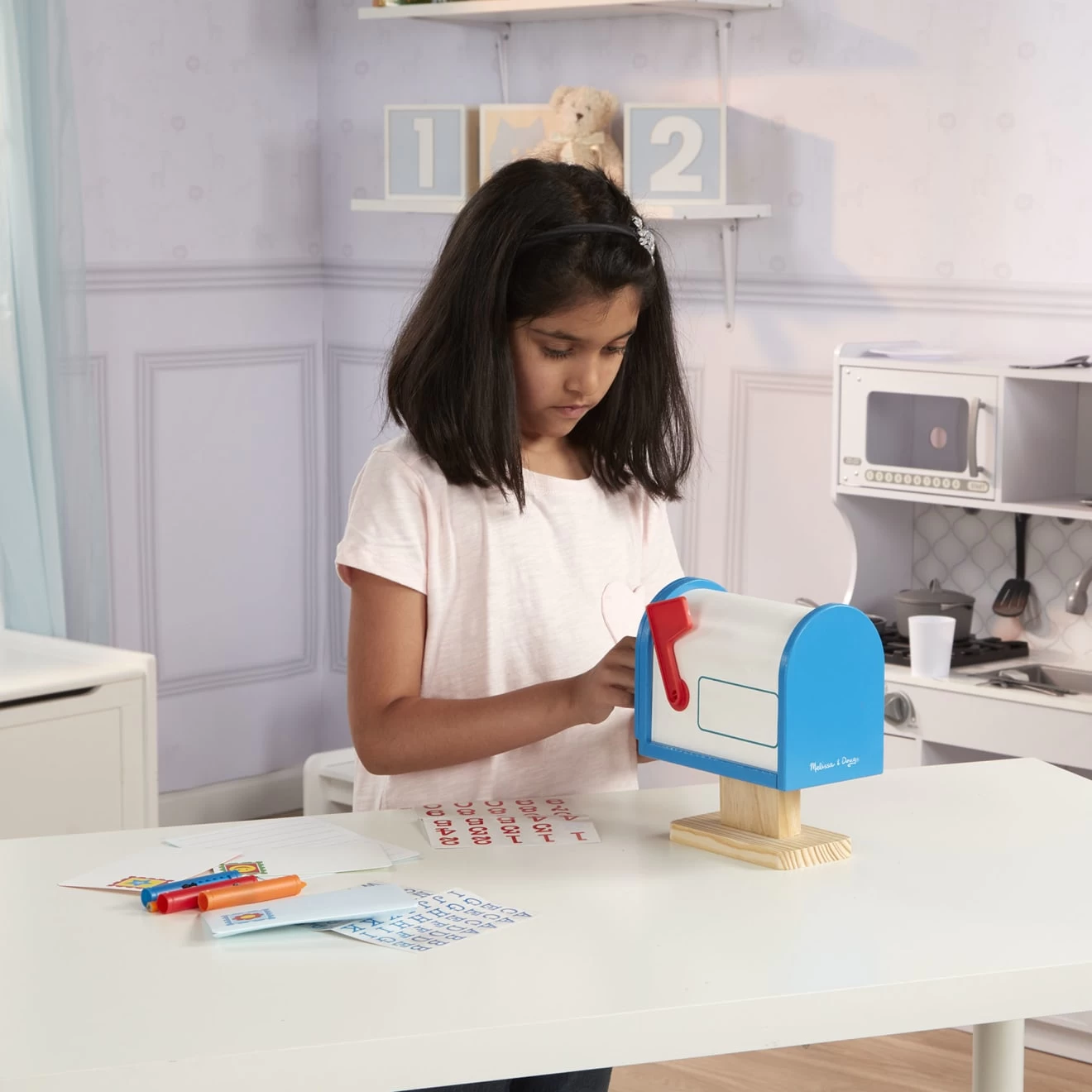 Everyone likes getting letters! Sending and receiving “mail” is even more fun with this toy mailbox, complete with a bright red flag. The sturdy wooden box comes with letter and number stickers so kids can decorate it with their name, address or a special message. The hinged door opens to make room for two postcards and a ruled letter and envelope, all reusable with the wipe-clean crayons that come with the set. Need even more inspiration? Drawing activities and play ideas are included to keep this letter box filled with creative correspondence and lots of fun! Melissa & Doug Classic Toys bring timeless play to modern families! Each toy is designed to fuel an endless world of imaginative play, while encouraging the kind of play-based exploration that naturally promotes key developmental skills. The sturdy wooden play pieces are tested to today’s highest standards of quality and safety.
