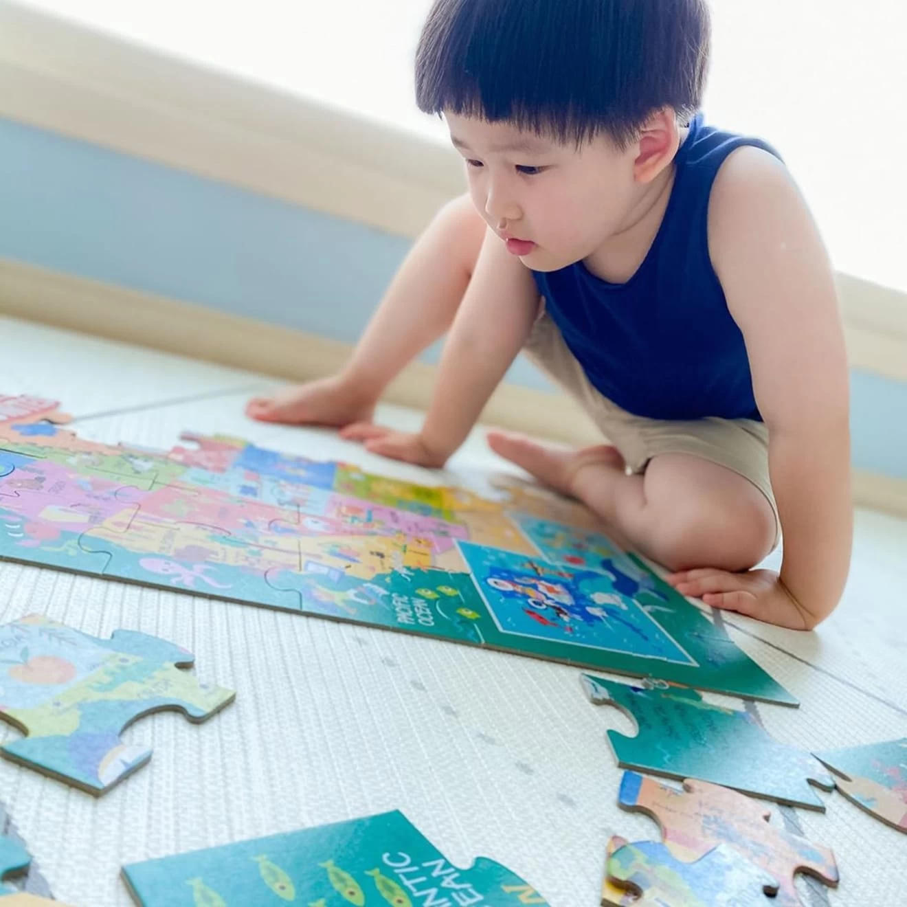 Piece together problem-solving fun with this Natural Play Giant Floor Puzzle! The 60 thick and sturdy oversized pieces are easy for little fingers to assemble into a 36″ x 24″ (91.4 cm x 61 cm) work of art. A seek-and-find activity on the take-along storage case helps kid explore the detailed scene. Natural Play puzzles use recycled papers and soy-based inks. They’re a hands-on way for kids to discover the world around them! Puzzle play can support early math skills and encourages logical thinking, goal setting, and patience.