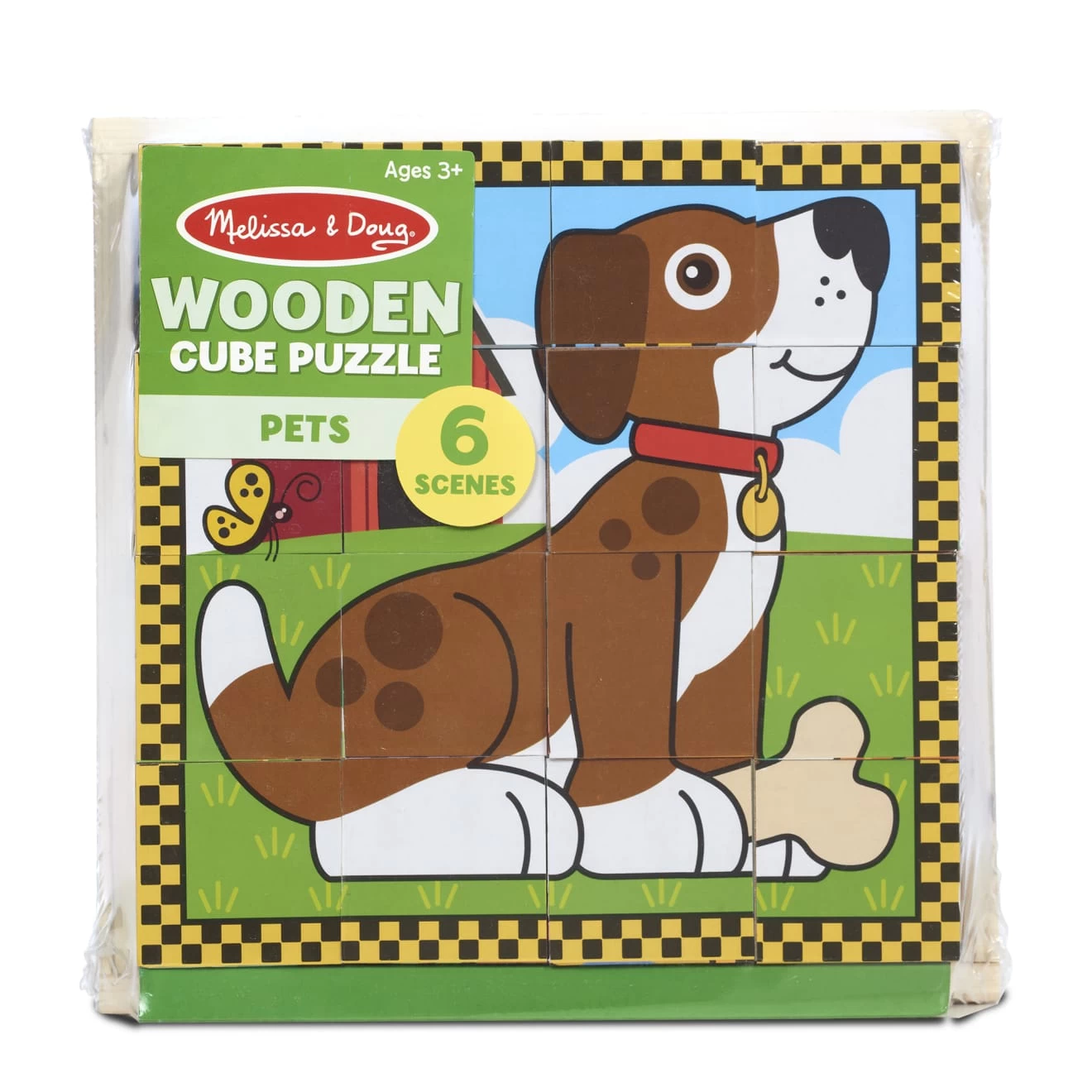 Six puzzles in one! There are 16 solid wooden cubes in this unique puzzle. One part of a colorful pet is pictured on each side. Rotate the cubes on the wooden tray to complete the six different animal pals!