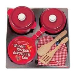 Get ready to cook up something yummy! This 8-piece wooden Kitchen Accessory Set comes with play kitchen pots, pans, and other accessories — everything you need to equip a little chef’s kitchen! The kitchen set includes a frying pan, a stockpot with lid, a saucepan with lid, plus a spoon, slotted spatula, and a red and white checkered oven mitt sized for little hands. Each of the cooking pieces is made of top-quality, durable wood. Playing with the cooking set provides opportunities for kids to practice dexterity, and hand-eye coordination. It also encourages pretend play as kids enjoy hands-on, screen-free fun. The set is an exceptional companion for play kitchens and other pretend play food-themed products and makes a great gift for kids ages three and older. Melissa & Doug products provide a launch pad to ignite imagination and a sense of wonder in all children so they can discover themselves, their passions, and their purpose.