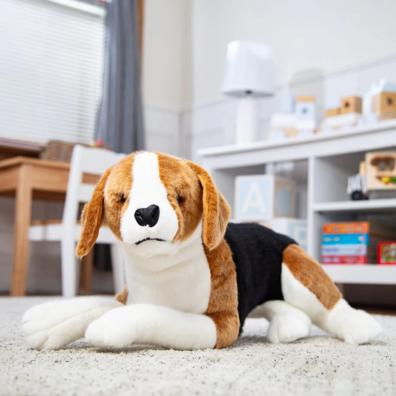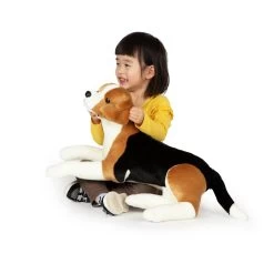 This adorable and beautifully constructed lifelike plush beagle is ready to play! Quality construction and realistic details, like soft, floppy ears and a friendly face, make this popular puppy a durable and lovable pal. Looking alert and ready ready for fun or snuggling, it lies approximately 11 inches tall and 24 inches long. This tri-colored beagle is sturdy but super-soft and huggable.
