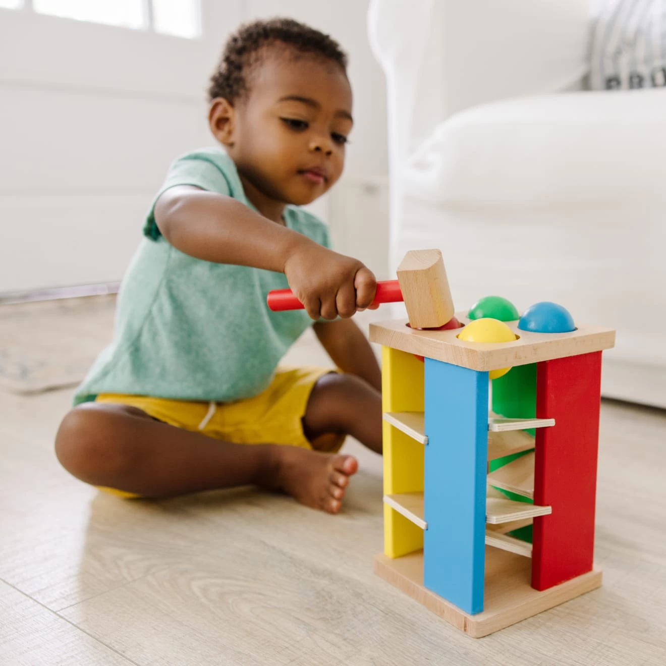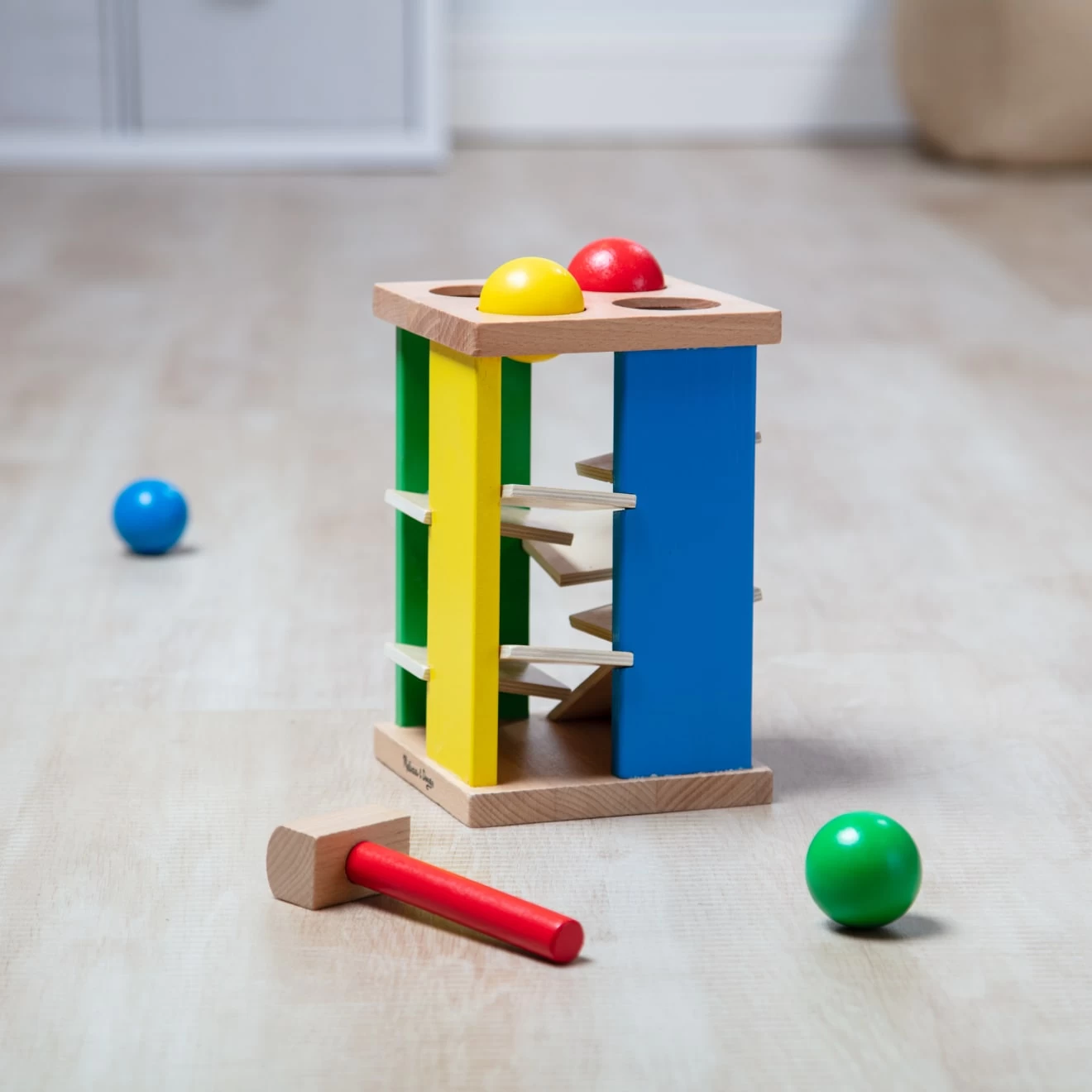 We’ve taken the classic pounding toy to new heights! Knock the four brightly colored balls through the holes, then watch and listen as they roll down the ramps. The sturdy wooden hammer included. This classic pounding toy is made from durable and child-safe materials that deliver exceptional quality and value, making it a top seller and a childhood favorite. The Melissa & Doug Pound & Roll Tower features brightly colored and smoothly sanded pieces that help children build early shape, color, and size-differentiation skills. It also provides parents and older children with an exceptional opportunity to explore additional play options with younger kids. For example, parents can count the number of balls and ask kids to repeat each number, or they can ask the child to place each ball in the hole by its matching color. The Melissa & Doug Pound & Roll Tower makes an exceptional gift for kids from 2 to 4 years. Add the Melissa & Doug Shape-Sorting Cube to round out the hands-on, screen-free play experience.