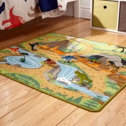 Bring to life the prehistoric giants who walked the earth millions of years ago with this sturdy, colorful dinosaur play rug! Durably made to look great for countless playtimes to come, the woven rug with a skid-proof backing comes with four flocked dinosaur figures (T-Rex, Triceratops, Stegosaurus, Apatosaurus) and features details like a bubbling volcano, waterfall, river, a cool cave, jungle, and grassland to give many options for creative play. Large format is big enough for multiple kids and lots of dinosaurs.