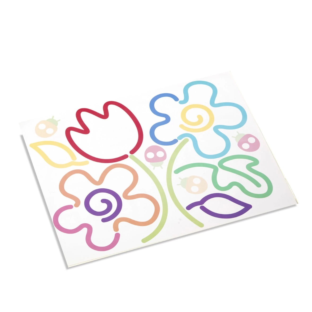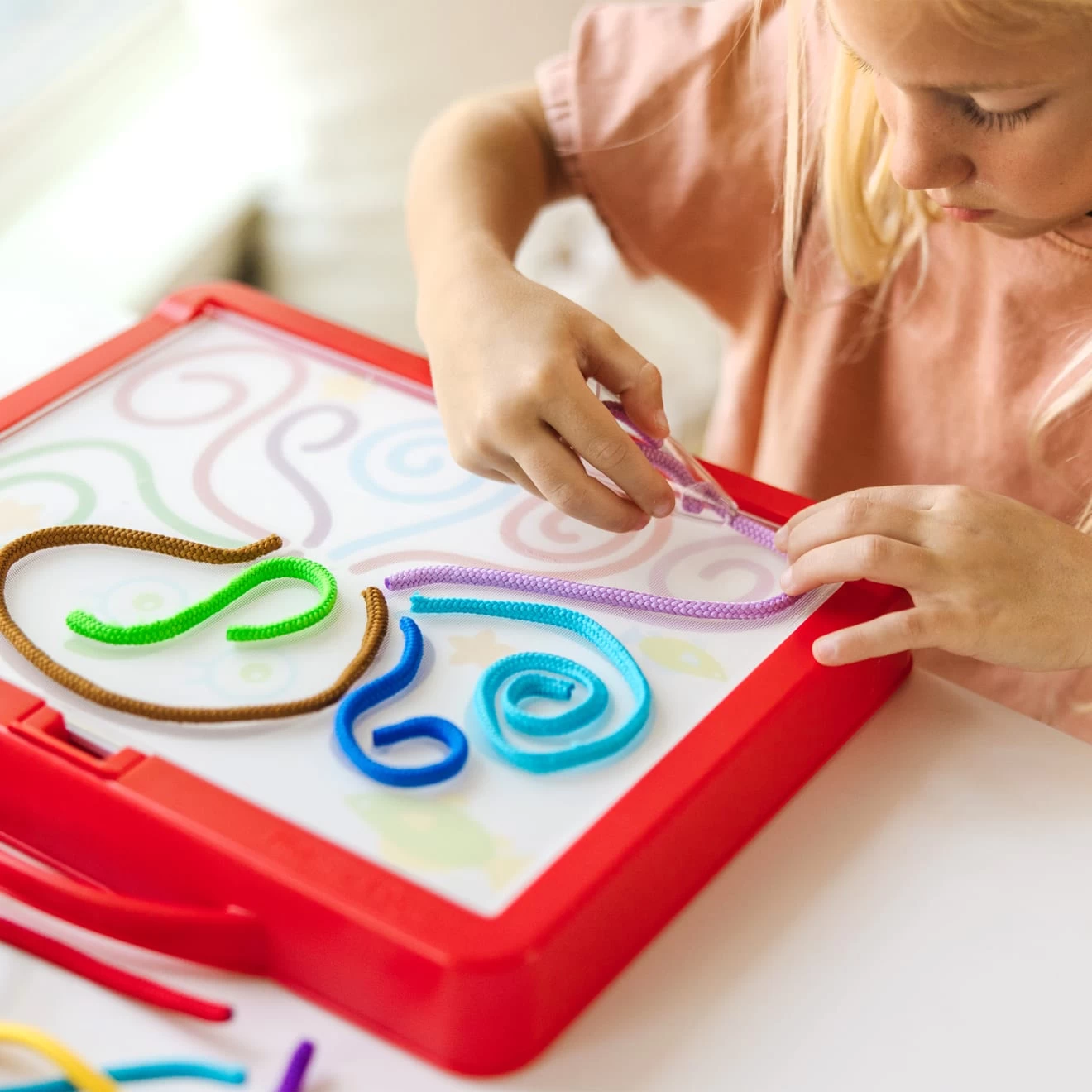 Use colorful cords to trace pictures (or create your own) on a self-stick surface again and again! Thread a six-inch or 12-inch cord into the easy-grasp drawing tool, slide a picture under the window with a hook-and-loop surface, and trace to draw! Cords cling to the surface and all materials store in the take-along case, making it a take-anywhere mess-free activity! The set includes 39 colored cords, cord drawing tool, six double-sided pictures to trace, and a take-along storage case.