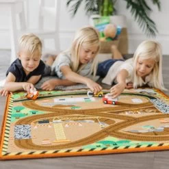 Get to work all around the construction zone with this sturdy, colorful construction site rug! Durably made to look great for countless playtimes to come, the woven rug with a skid-proof backing comes with three wooden construction vehicles and features details like a crane, wheelbarrows, barriers, cones, and roads to accommodate all kinds of vehicles, play people, and more! With this rug, there are lots of ways to learn and play.