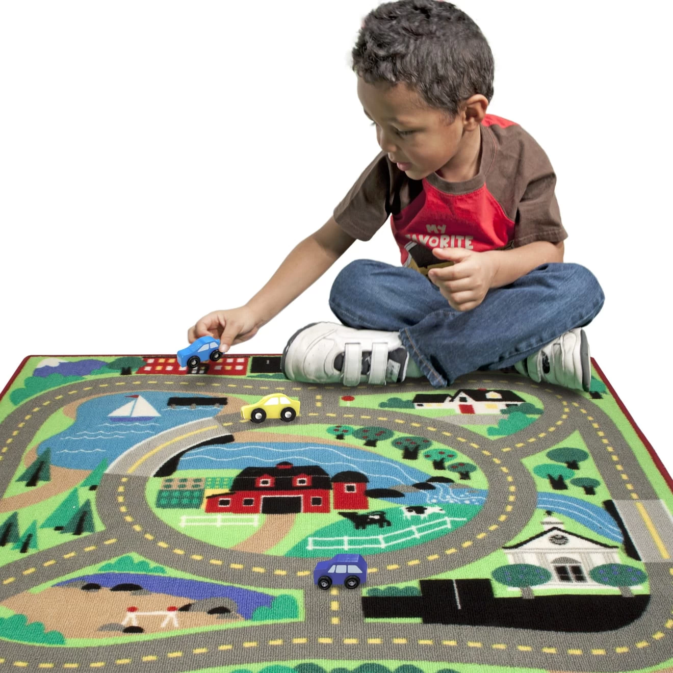 This colorful road rug comes with four cars to drive on looping streets and lanes — and its varied terrain makes it ideal for trains, chunky play figures, and vehicles of all kinds! Durably made to look great for countless playtimes to come, the woven rug features a handsome farm surrounded by a circular road system, which connects a school, parking lot, grocery store, lakeshore, and more — all in a convenient arrangement that makes it easy for kids to play.