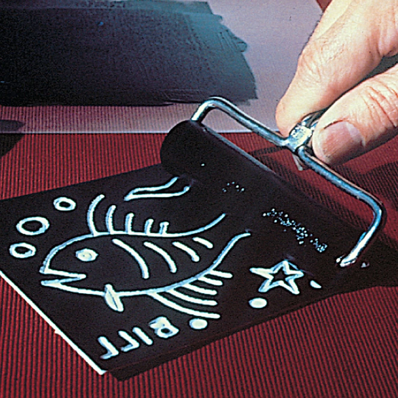 This “soft as butter” heavy foam material lets artists produce printmaking plates without cutting tools – just use a wooden stylus, pencil or ballpoint pen! The sensitive surface easily imprints with shapes, lines and textures. Each “plate” can make dozens of clear prints on the paper of your choice. Just roll on water-based ink, press with a rubbing stick or brayer and print!