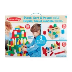 Exercise fingers and brains with these beautifully crafted, made to last classic wooden toys designed to entertain and engage! The Melissa & Doug Stack, Sort & Pound Wooden Toy Collection includes three childhood favorites: 100 brightly colored building blocks, a 14-piece shape sorting cube, and a 10-piece pounding bench with mallet. Kids two and older will delight in stacking, building, sorting, and hammering, while gaining invaluable practice with fine motor skills and dexterity, color and shape recognition, and pre-math skills.