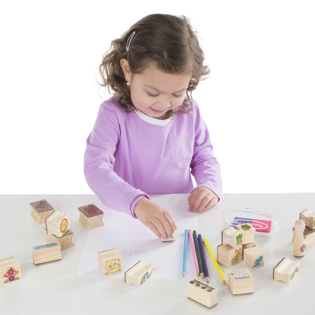 Fairies, flowers and garden critters can be combined in countless pretty ways! This extra-large stamp set for kids makes it easy to create an exciting storyline or a color-in scene: It includes 20 rubber-faced, wooden-handled outline stamps and a two-color stamp pad filled with pink and purple washable ink. Five colored pencils coordinate with the garden theme to add details and color in the scene. It’s a complete arts & crafts activity and storytelling kit in one!