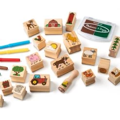 A barn, tractor, sheep, bunny, pig, and a barn’s worth of animals and crops come in this color-in stamp set for kids! This extra-large set of wooden stamps makes it easy to create an exciting storyline or a color-in scene: It includes 20 rubber-faced, wooden-handled outline stamps and a two-color stamp pad with brown and green washable ink. Five colored pencils coordinate with the farm theme to add details and color in the barnyard scene. It’s a complete arts & crafts activity and storytelling kit in one!