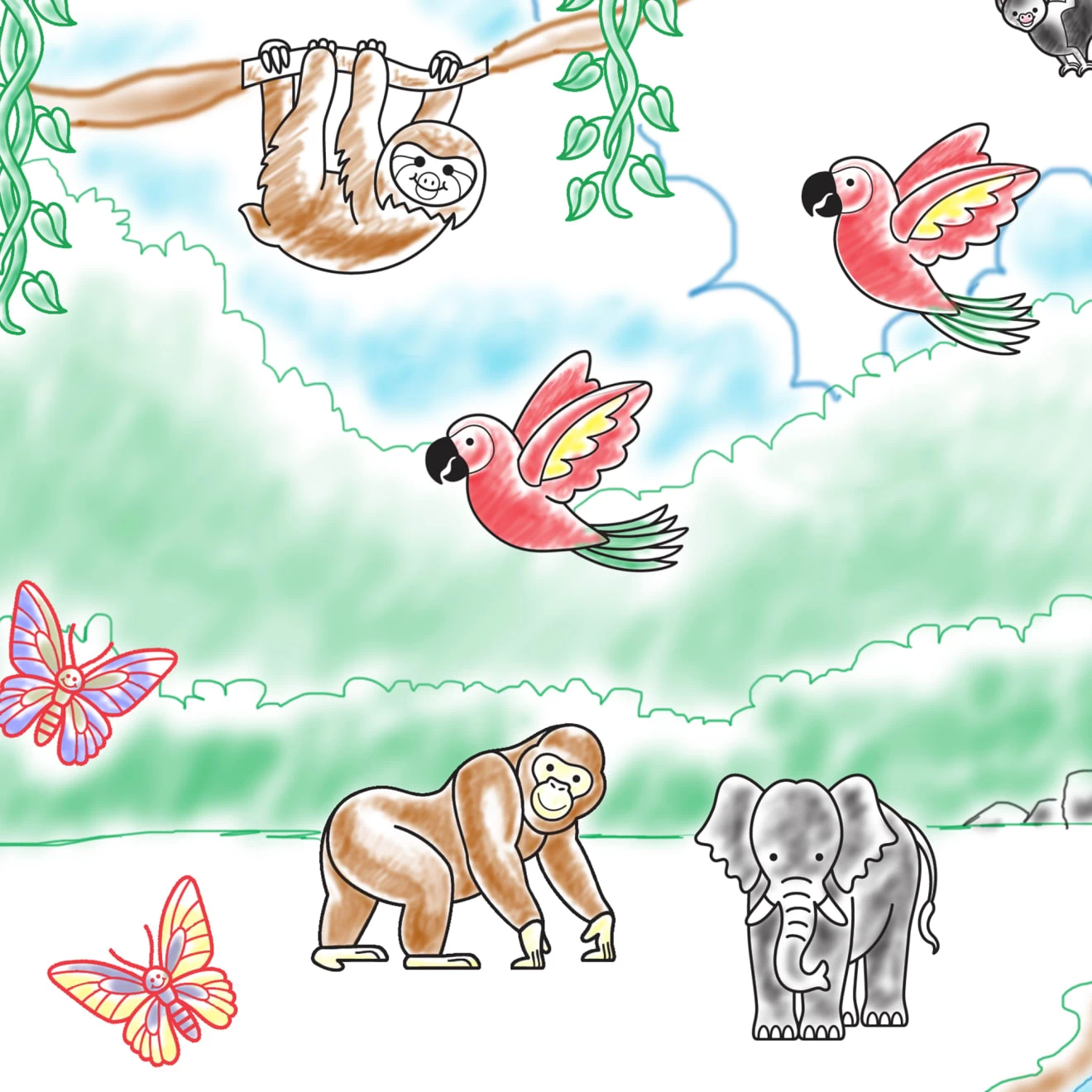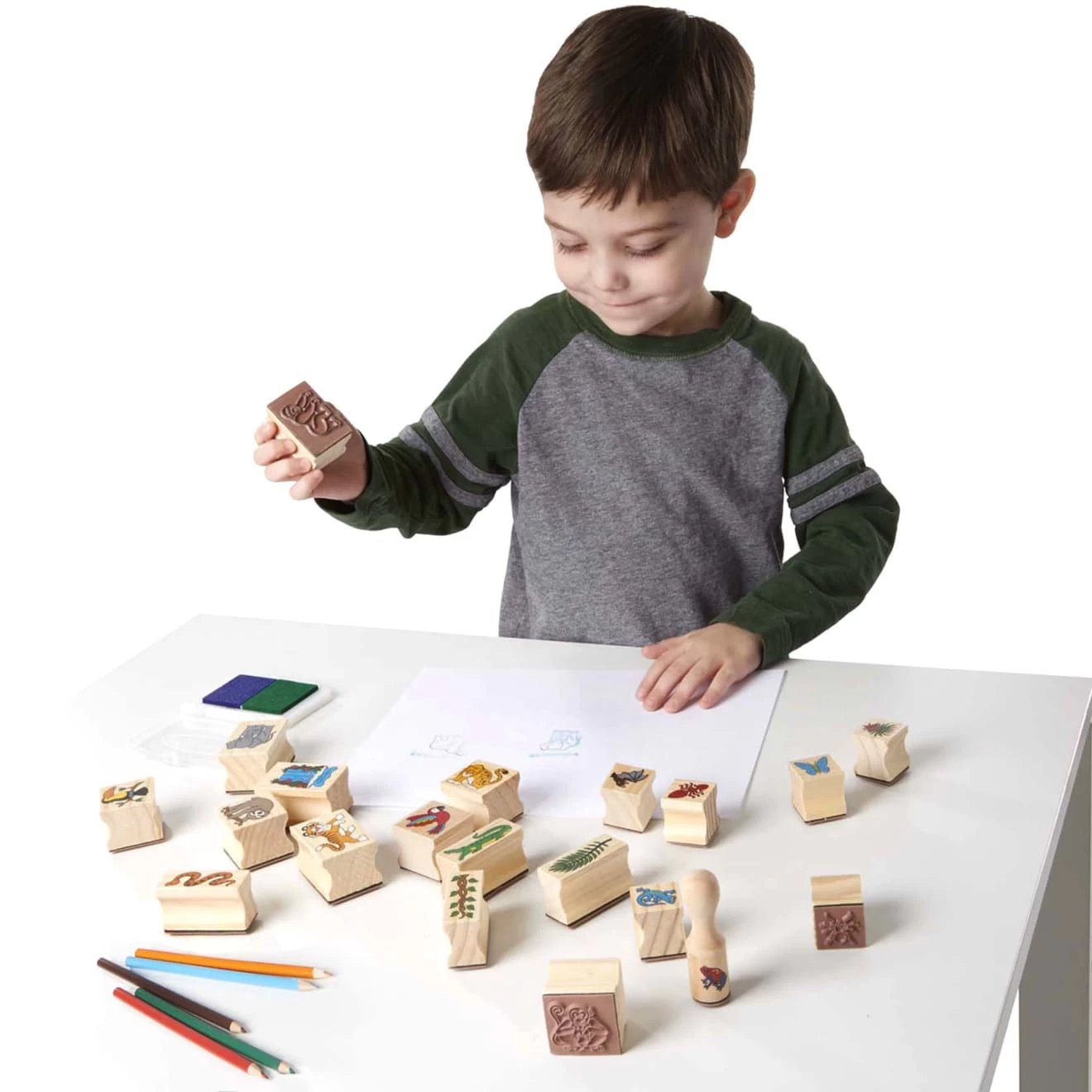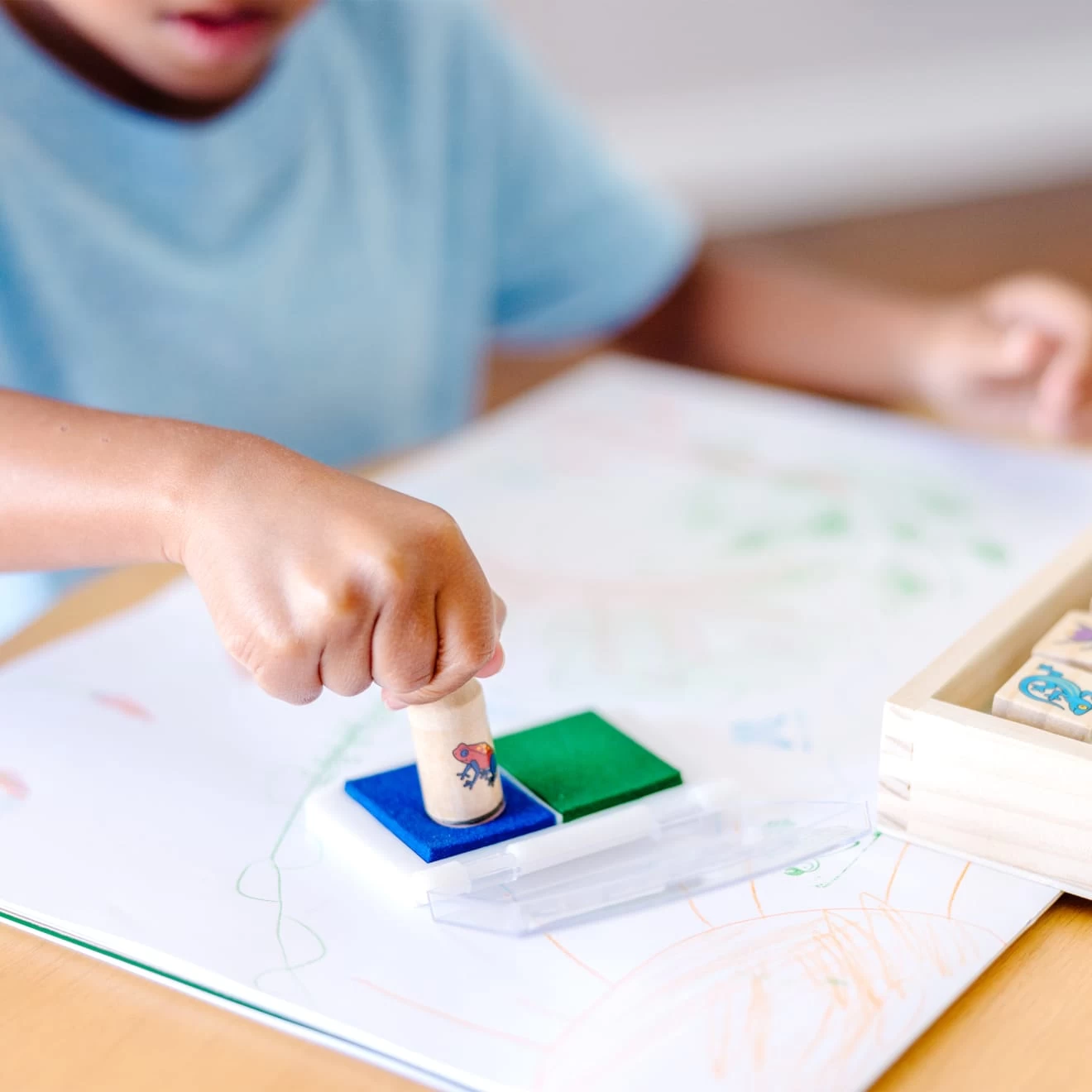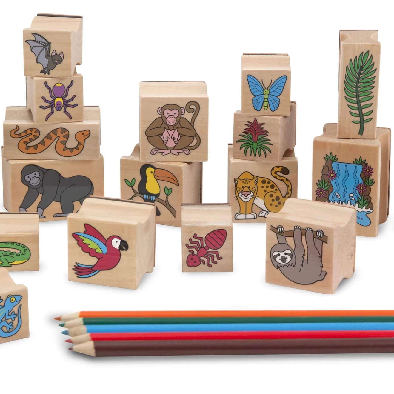Monkeys, snakes, birds and bugs galore combine to create a jungle straight out of your imagination! This extra-large stamp set for kids makes it easy to create an exciting storyline or a color-in scene: It includes 20 rubber-faced, wooden-handled outline stamps and a two-color stamp pad filled with blue and green washable ink. Five colored pencils coordinate with the jungle theme to add details and color in the scene. It’s a complete arts & crafts activity and storytelling kit in one!