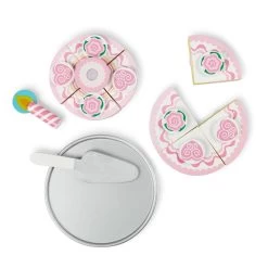 This play-food set contains a very special cake for very special occasions . . . like pretend play any day! With self-stick tabs on each piece, the wooden sections stick together easily then slice apart with the included wooden knife. Pretty decorations can mix and match to make every party unique!