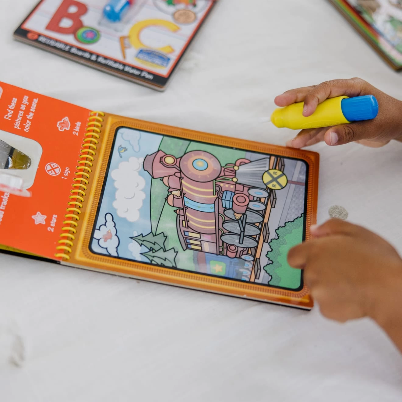 No-mess painting for kids! Each of the three themed pads (Vehicles, Animals and Alphabet) in this exciting paint-with-water coloring book set includes four reusable pages and a refillable water pen. Simply use the pen to color in each scene–details and vibrant color appear with every stroke! Then let the page dry to erase the pictures and color it in again and again. The chunky-sized water pen is easy for kids to hold and stores neatly right in the front cover, making Water Wow an ideal on-the-go activity.