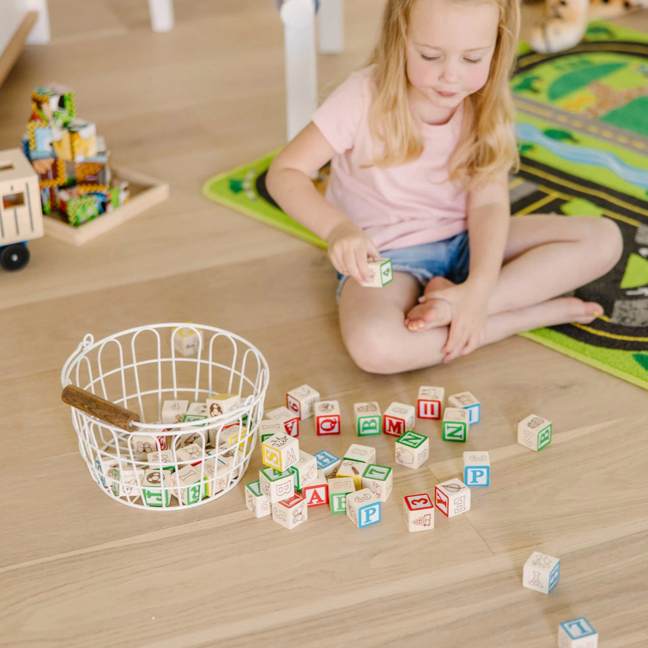 Hours of timeless block play await your toddler! This wonderful set of 50 traditionally styled one-inch cube blocks features charming hand-painted artwork. Solid wood blocks with a colorful collection of pictures, letters and numbers encourage matching, stacking, sequencing and sorting. A tremendous value that will last for years! Conveniently stores in an included pouch.