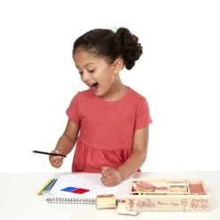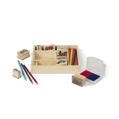 Go wherever your imagination takes you! It’s easy to mix and match these detailed vehicle and traffic sign stamps to create hundreds of visual adventures. All the pieces, including the 2-color inkpad, store in a sturdy wooden box. Washable, kid-friendly ink.