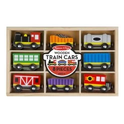 All aboard for some railroad adventures! Eight wooden train cars, each approximately three inches long, link together with magnetic couplers in endless combinations for lots of imaginative play. Brightly painted and beautifully crafted train cars include a steam engine, caboose, coal car, passenger car, and more. This set is sized to play perfectly with Melissa & Doug activity rugs or on its own. Pieces all store neatly in the compartmentalized wooden tray.