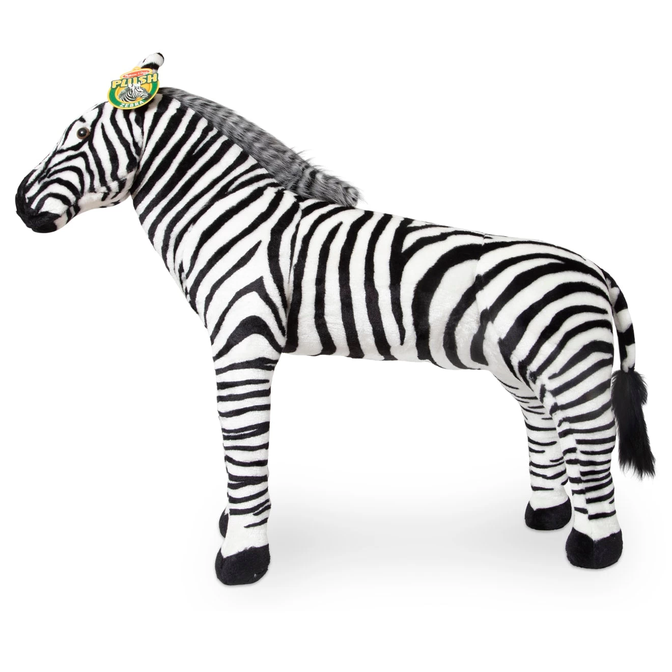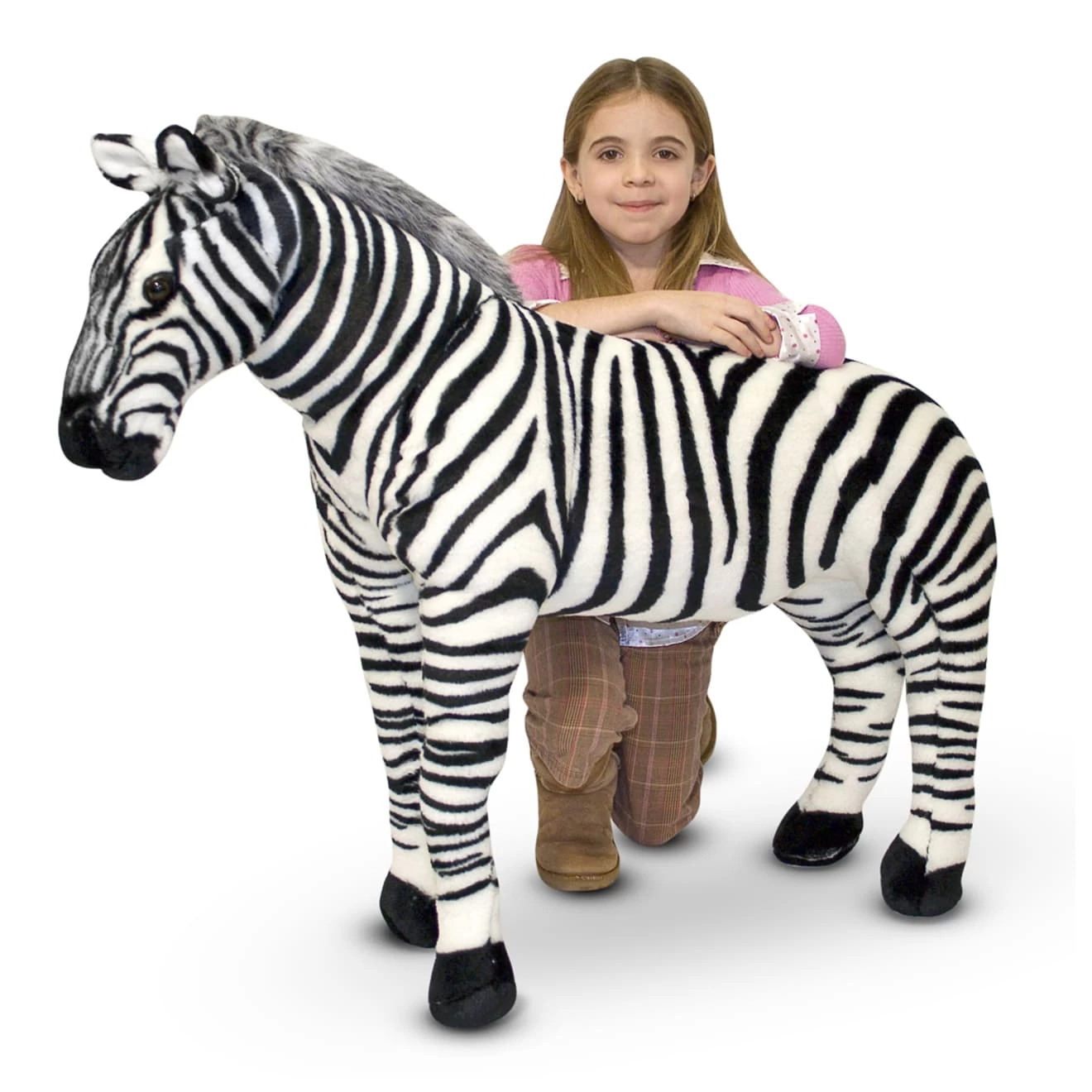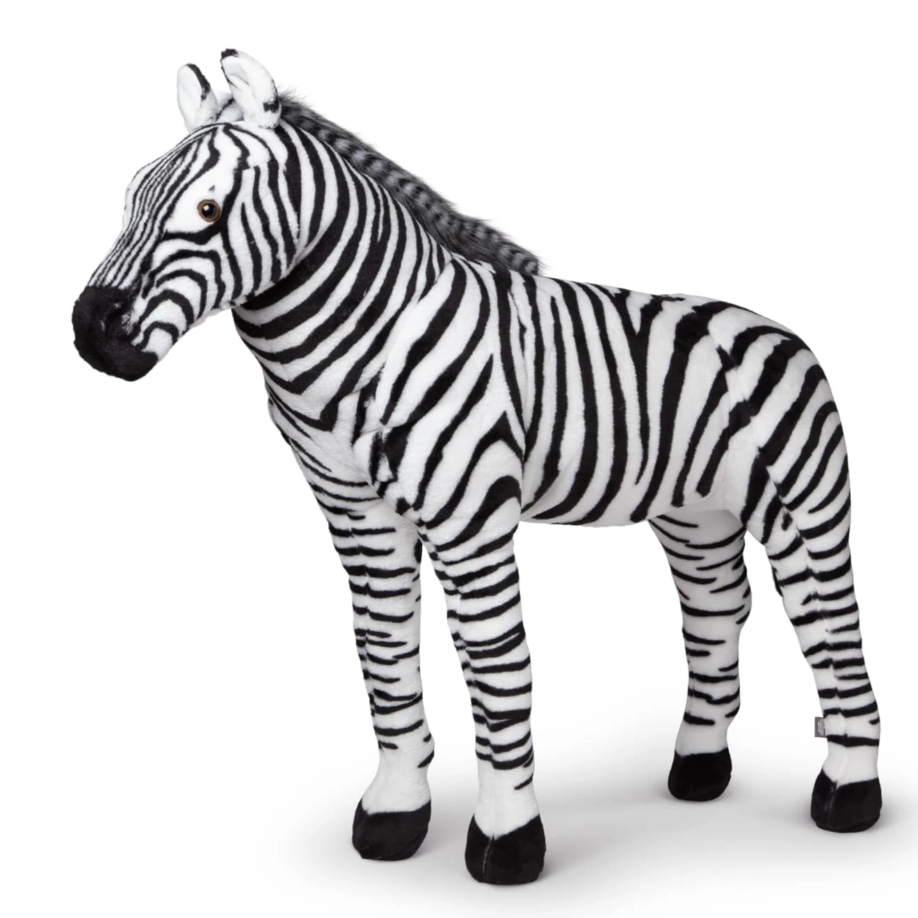 This giant plush zebra brings the African savannah right into your home! The gorgeous zebra has life-like features, amazing details, and a soft, black and white striped coat. With its sweet face and expressive eyes, the plush zebra makes a great companion for animal lovers. It’s beautifully constructed of superior materials including soft, furry fabric and a strong internal frame that keeps the zebra standing upright. It’s almost three feet tall from its black hooves up to its wild, fuzzy mane. Kids can snuggle up to the zebra during story time and let their imaginations go on wonderful adventures. They can even read a story to their soft and cuddly friend. You don’t have to be a little kid to enjoy the Melissa & Doug Zebra Giant Stuffed Animal — it makes a great companion and delightful gift for kids ages three to 103. (Not intended as a seat or ride-on.)